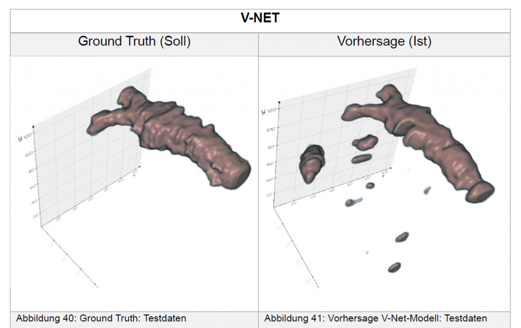 Das zentrale Ergebnis: Die V-Net-Architektur erzielte die beste Performance. Mit der optimalen Kombination aus Aktivierungs- und Loss-Funktion erreichte das Modell einen Dice-Koeffizienten von 62,48 % in der Validierung. In der Zusammenfassung der Arbeit wird zusätzlich hervorgehoben, dass V-Net kontinuierliche Venenstrukturen abbilden konnte und bei der Verarbeitung von Volumendaten besonders überzeugte.